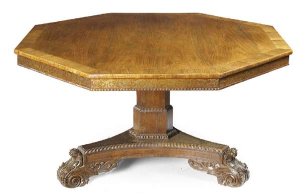 FINE REGENCY MAHOGANY AND BRASS INLAID OCTAGONAL DINING TABLE