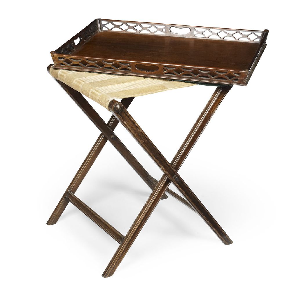 the fret pierced tray with open work carrying handles, raised on a folding X-form base