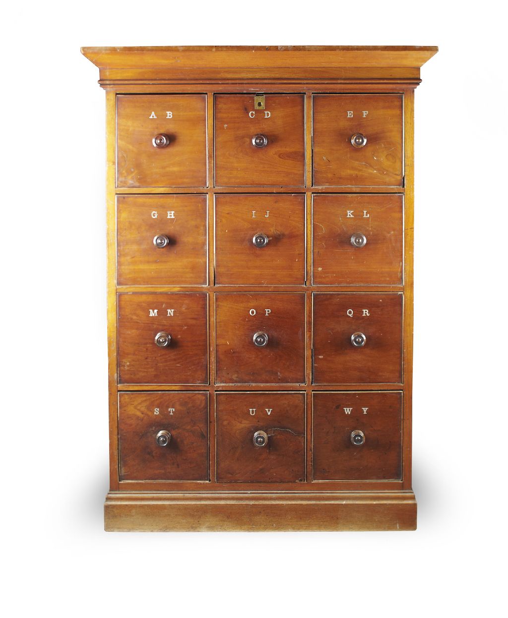 the canted moulded cornice above twelve deep fall front drawers with mother-of-pearl inlaid letters and turned bun handles, raised on a moulded plinth base