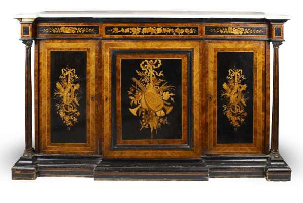 the breakfront marble top above three panelled cupboard doors inlaid with trophy motifs, opening to reveal a shelved interior, flanked by fluted Corinthian pilasters, and raised on a plinth base