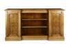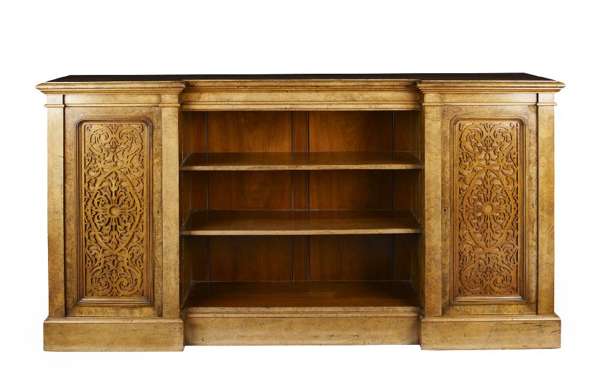 the moulded inverted breakfront above open adjustable shelves, flanked by two blind fret carved panel doors, opening to reveal further shelves, raised on a plinth base