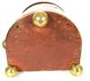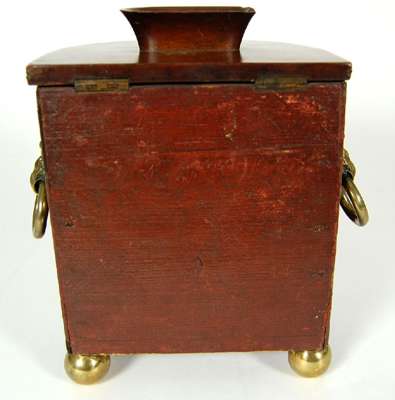the hinged lid with a coin aperture enclosing a brass lined interior, the sides with lions' mask and loop handles and a brass plaque inscribed 'Missionary Box' raised on brass ball feet