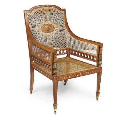 EDWARDIAN PAINTED SATINWOOD BERGERE ARMCHAIR