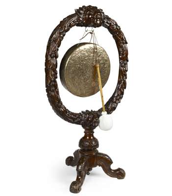 the hammered gong within and oak leaf carved support surmounted by a lion's mask motif, raised on a tripod base