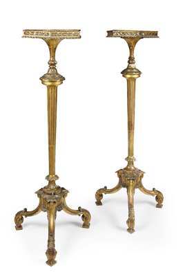 the hexagonal fret pierced galleried tops, raised on stop fluted turned column supports, ending on acanthus carved cabriole scroll tripod bases (2)