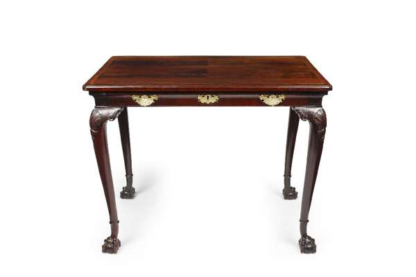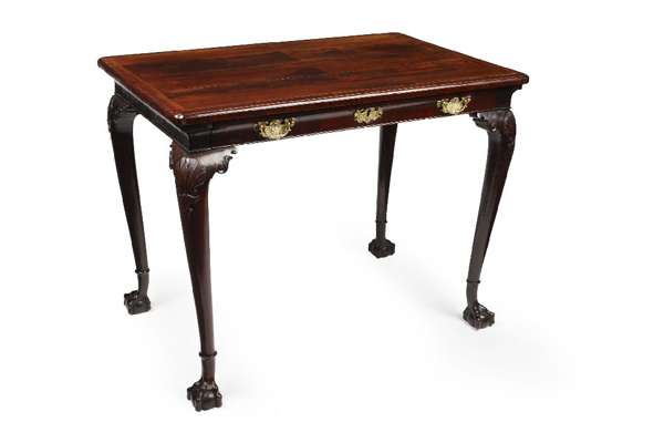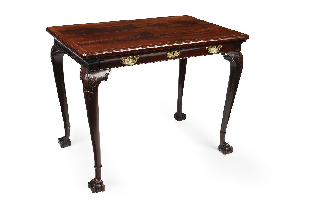 the moulded rectangular top with later brass inlay, above an ogee moulded frieze drawer raised on shell carved cabriole legs terminating in claw and ball feet