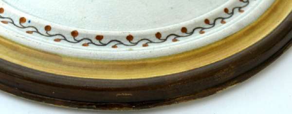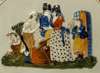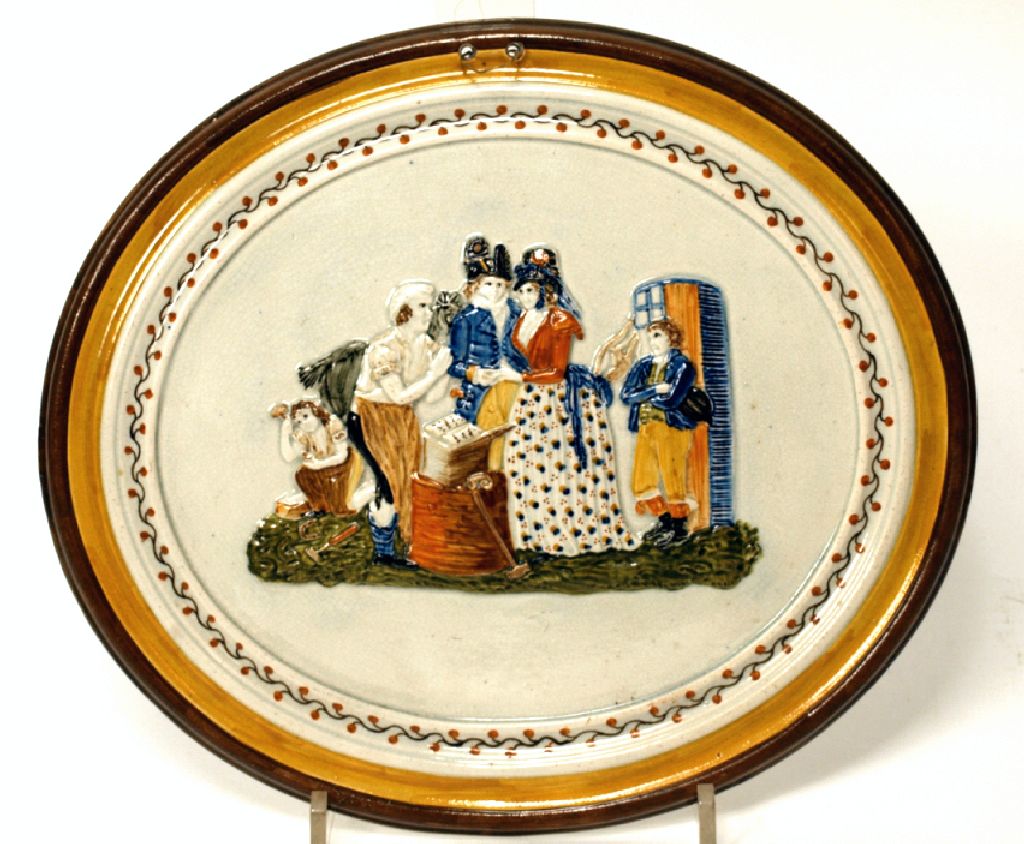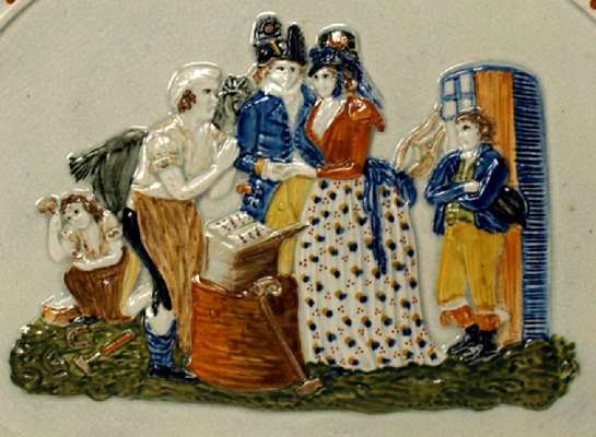 depicting a couple getting married, with man officiating and two children looking on, framed by a border of stylised flowers and further ochre and brown borders