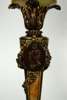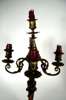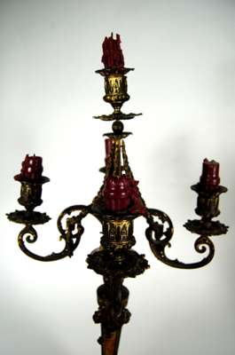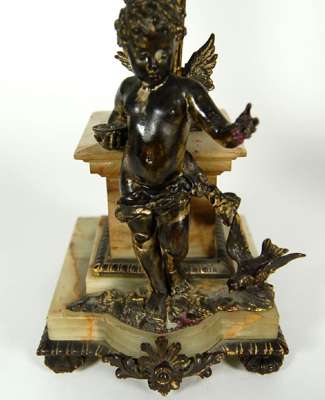 the square bases with applied winged cherubs and doves, the tapered columns centred by portrait medallions and surmounted by five candle branches (2)