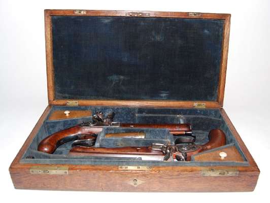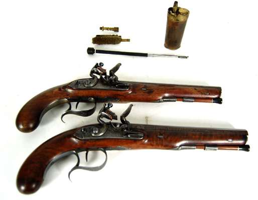 the engraved locks with safety slides signed Innes, spurred trigger guards with acorn finials, the re-browned octagonal barrels engraved (refreshed) EDINBURGH, plain walnut full stocks with some repairs to both stocks, in associated oak case lined with blue velvet and with a copper pistol flask with container on top for ball and at the base for patches or flints, replacement ramrods