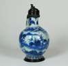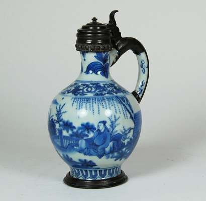 of bottle shape, the body decorated with servant bringing food to his master, plain handle, the whole with pewter mounts, paper label