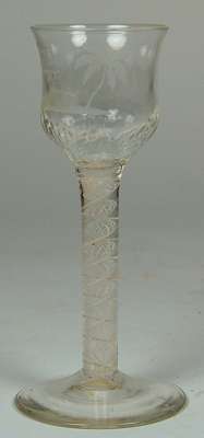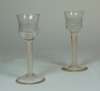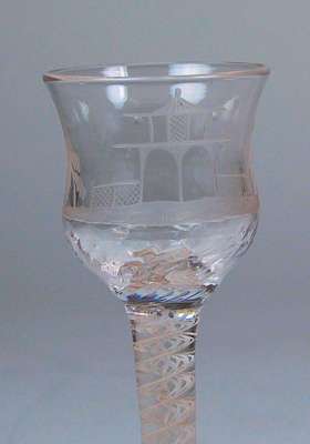 slight ogee moulded bowls, engraved with pagoda on plain white twist stem (2)