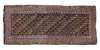 the dark indigo field with allover boteh in yellow lattice pattern, within red and ivory diagonal stripe border between cream and yellow bands
