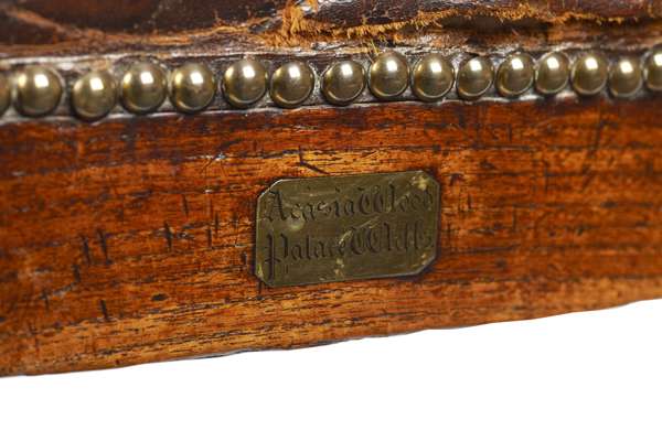 covered in studded brown leather, with acanthus carved scroll arms raised on lappet carved baluster turned legs terminating in brass cappings and ceramic castors, bearing brass plaque 'Acasia Wood Palace Wells', the underside stamped 'GRD' twice
