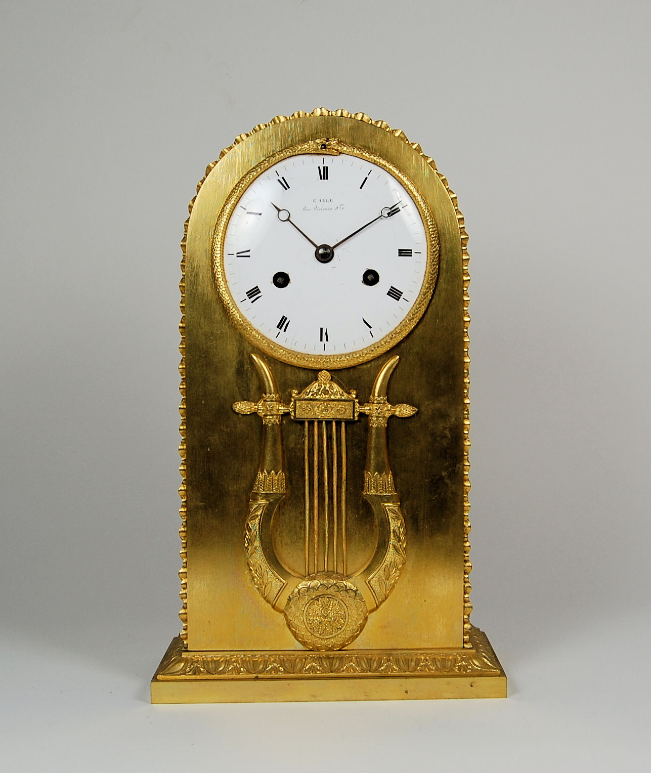 the white enamel dial signed Galle, Rue Vivienne No.9, with a bell striking 8-day movement, the domed case with cast stiff leaf decoration and applied with a coiled serpent and lyre motif