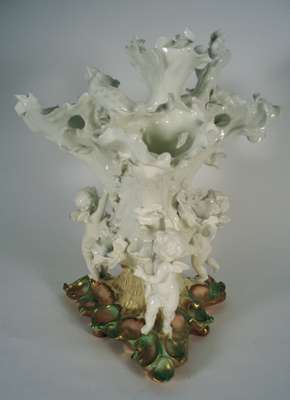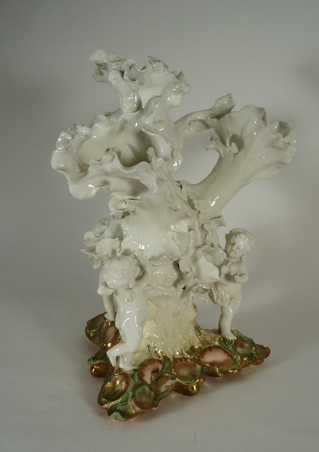 the triform base moulded with shells, from which issues four outscrolling naturalistic trumpet form vases supported by three cherubs, impressed and painted marks