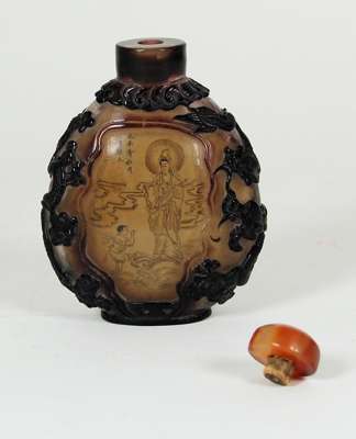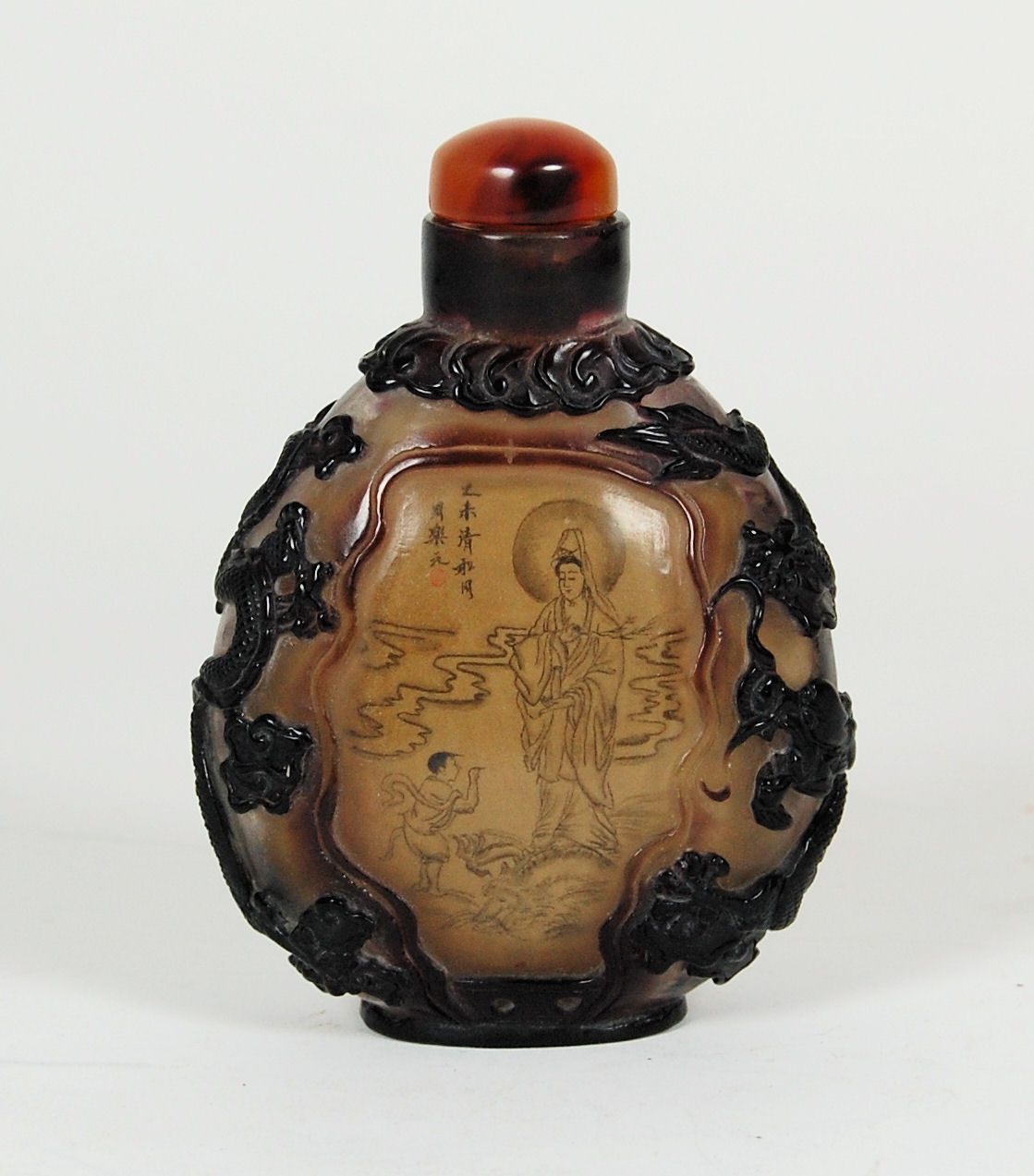 the overlaid flatted ovoid sides decorated in high relief with dragons, painted with panels depicting Guanyin and immortals