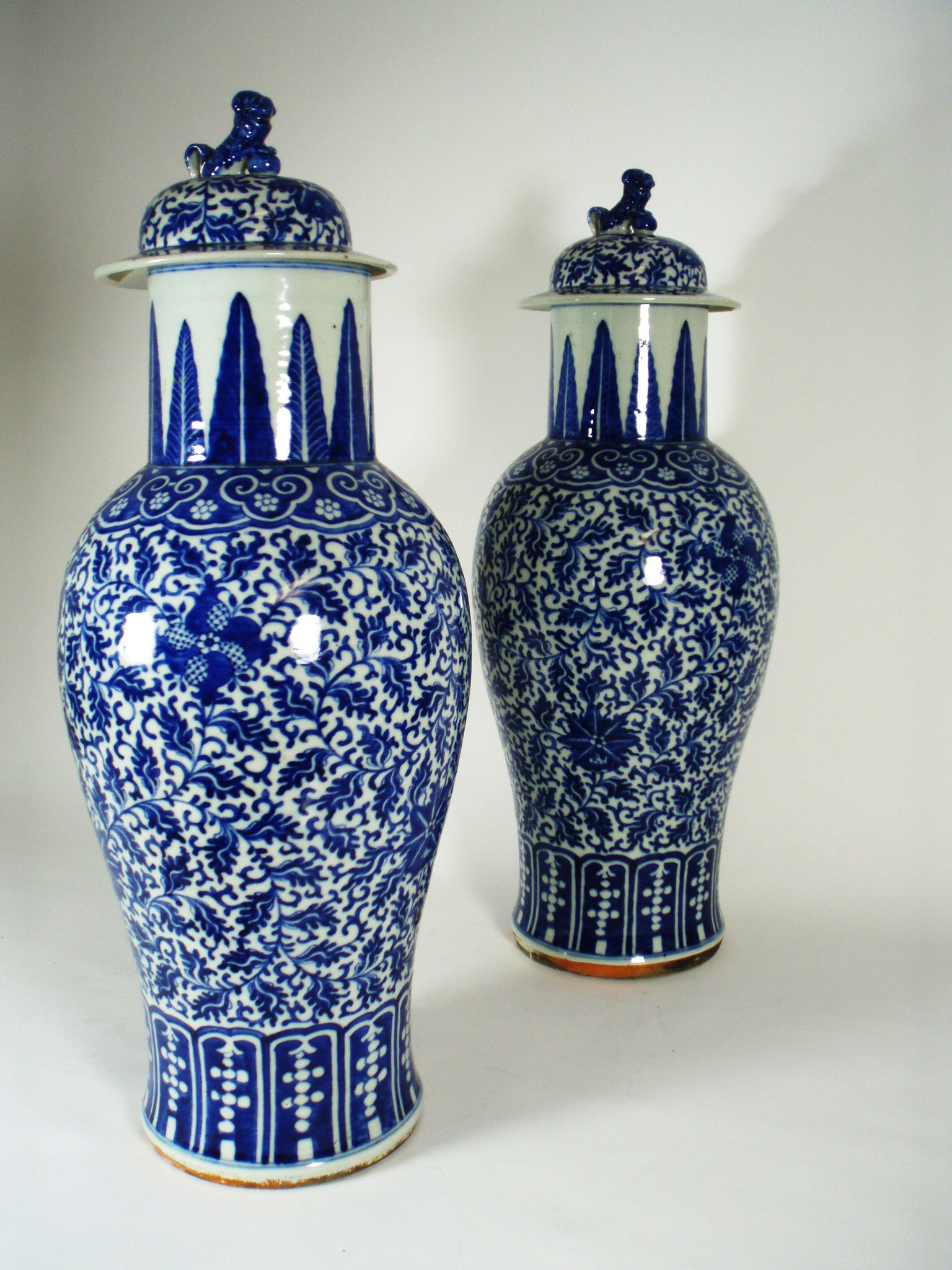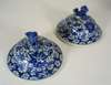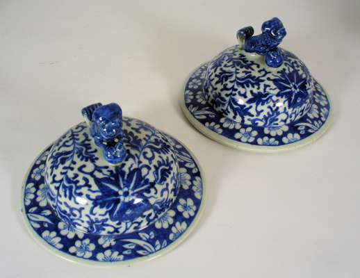 the domed covers surmounted by fu lions, decorated throughout in underglaze blue with scrolling foliage