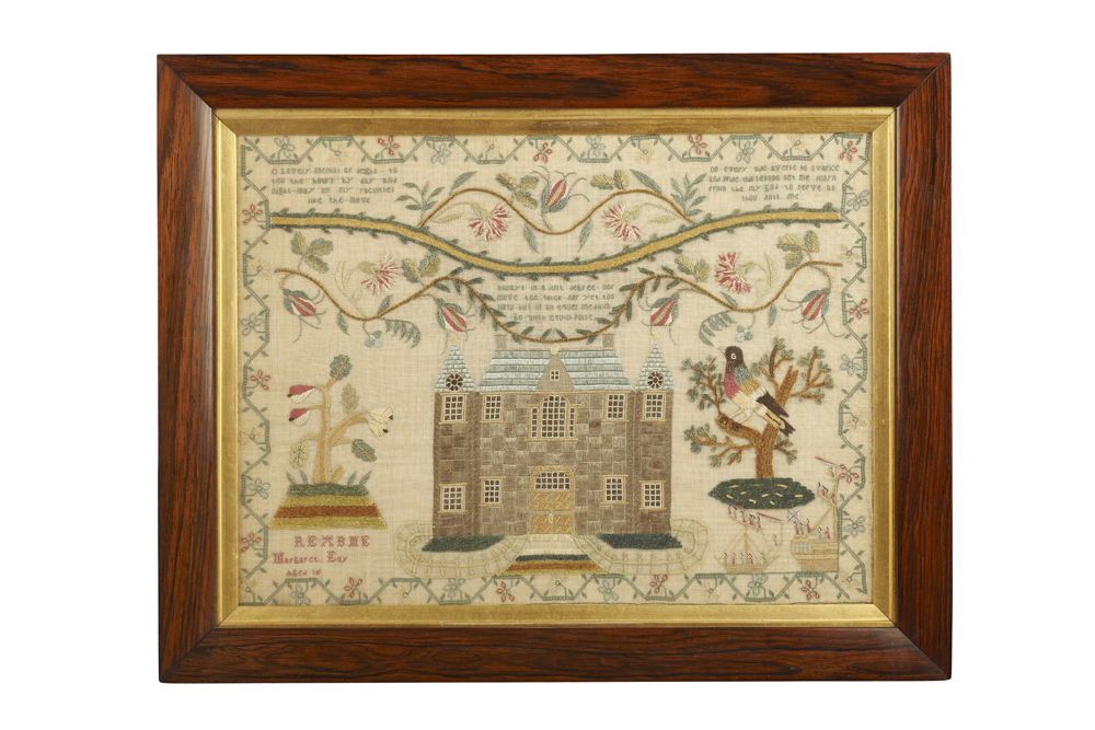 woven with a central turreted house within scrolling foliage, religious verses, exotic birds, and sailing ships, by Margaret Elly, aged 16