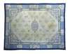 the cream field with central indigo open vine medallion, similar spandrels, within cream lattice and floral cartouche border between cream inner and indigo outer bands