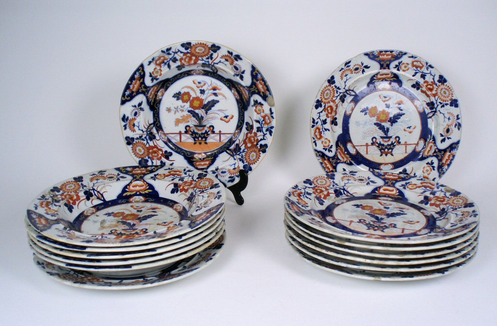 decorated in the imari palette with baskets of flowers, comprising: seven soup bowls and seven dinner plates (14)