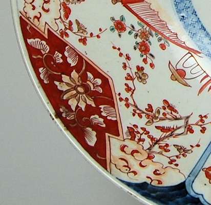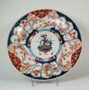 of circular form, the well with central roundel painted with a basket of flowers, the border with fan shaped panels with blossoms and dogs of fo