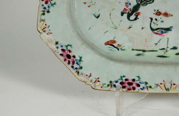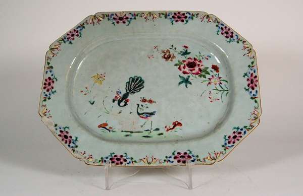 each of canted rectangular form, the well painted with a pair of peacocks and a peony blossom spray