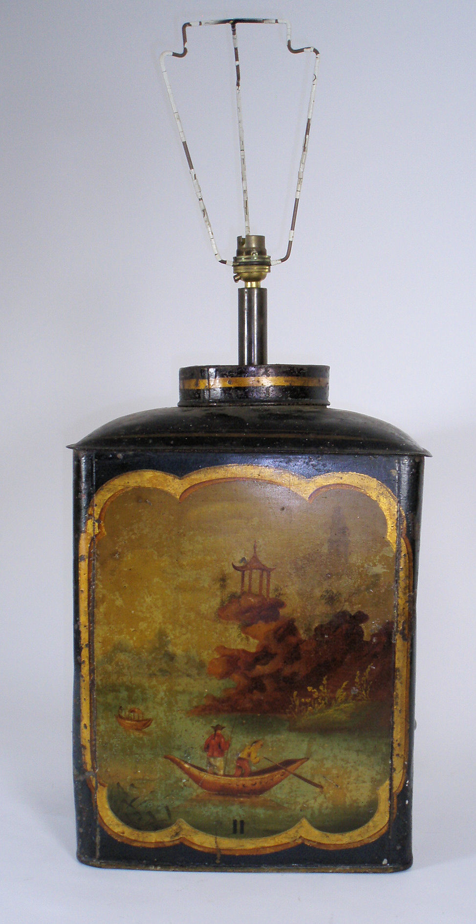decorated with a chinoiserie panel depicting fishermen, converted to a lamp