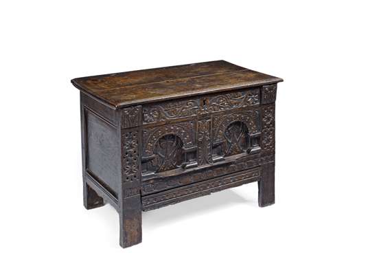SMALL CHARLES II CARVED OAK COFFER