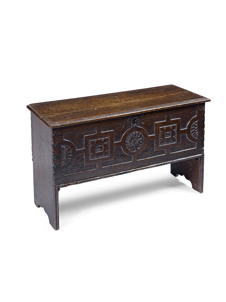 the moulded hinged lid enclosing a void interior, above a geometric and stylised foliate carved front, raised on shaped end supports