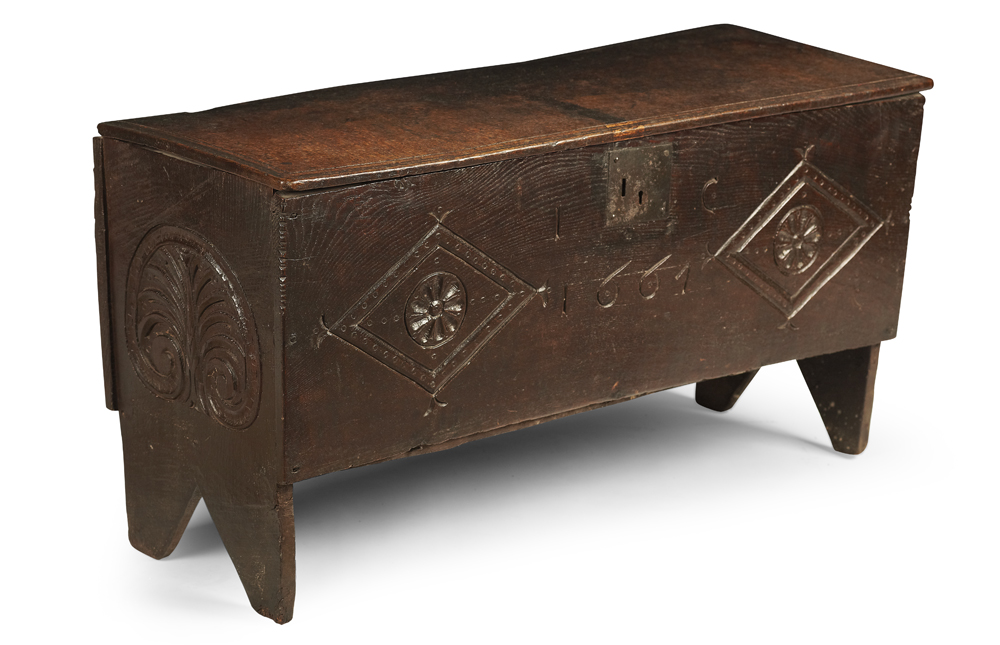 the moulded hinged lid above a lozenge carved front, inscribed 'I C, 1661', raised on twin end supports