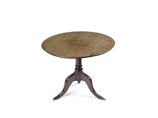 the padded seat raised on baluster turned legs united by a peripheral stretcher; together with a George III mahogany commode, raised on square chamfered legs; and a George III oak tripod table, reduced in height (3)