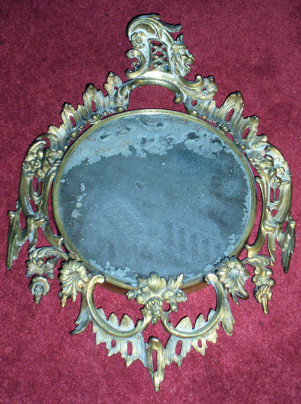 the shaped plate within an ornate openwork rococo scroll frame; together with a Victorian brass wall mirror, in the Chinese Chippendale style (2)