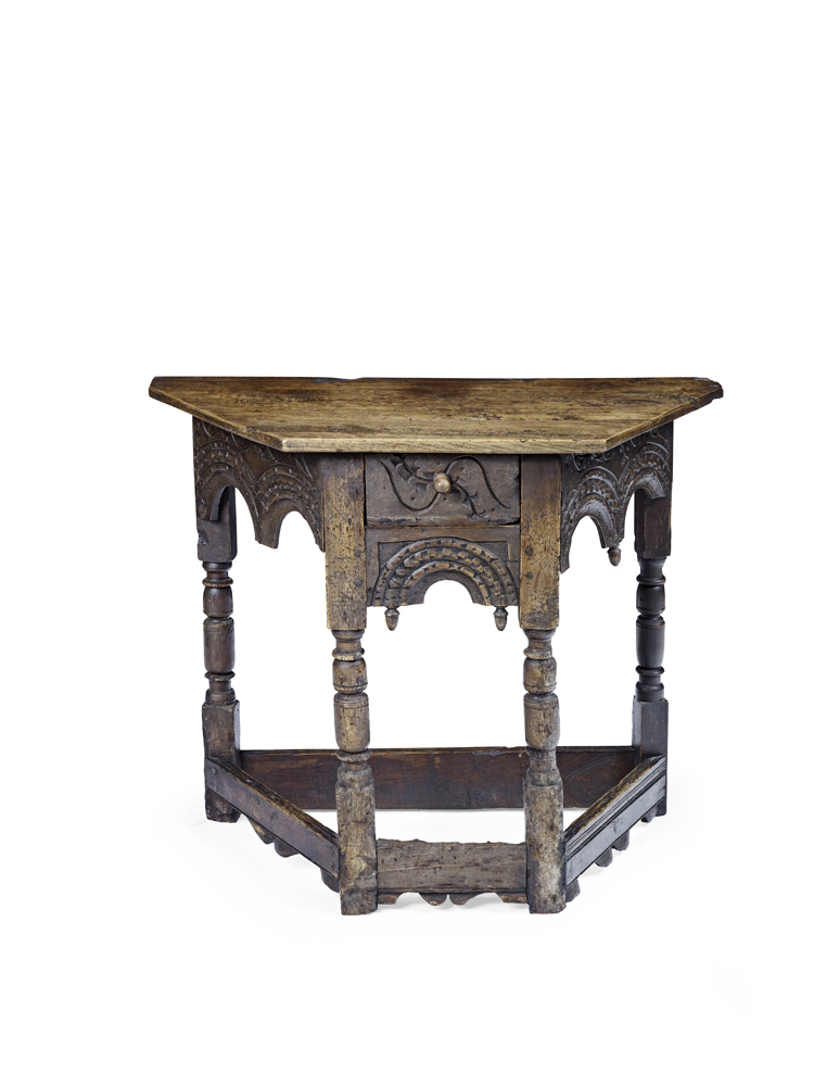 the shaped top above a shaped carved frieze fitted with one short drawer, raised on baluster turned legs united by peripheral stretchers