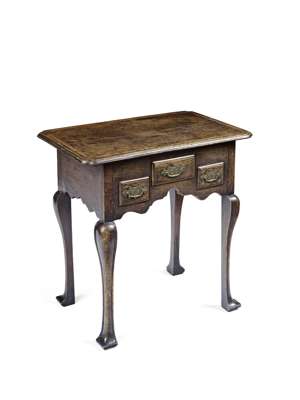 the moulded top above one frieze drawer, raised on baluster turned legs united by a wavy X form stretcher, ending in bun feet