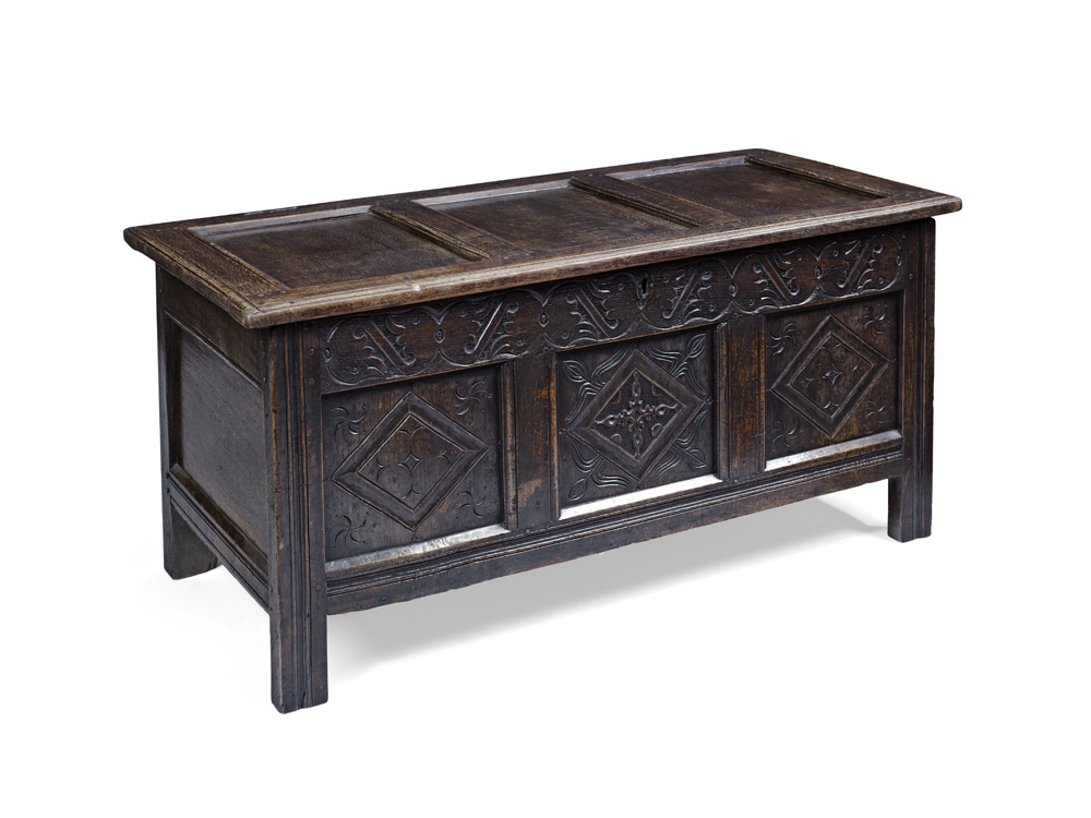 the triple panel hinge top above a foliate carved frieze and conforming lozenge carved panelled front, raised on stile feet