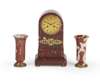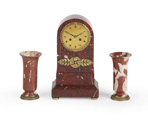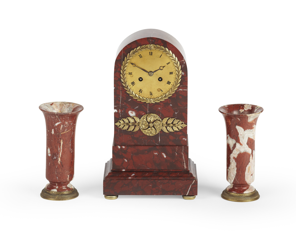 cylinder movement striking on a bell, the gilt dial with black Roman numerals with laurel surround contained within a red marble case of arched form on bun feet, with similar red marble garniture of flared tapering form (3)