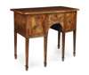 the crossbanded top above one central frieze drawer, flanked by two further deep, one fitted as a cellarette, raised on square tapered legs ending in spade feet