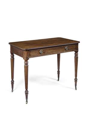 the reeded rounded rectangular top over a cock beaded long frieze drawer raised on tapering square legs terminating in brass caps and castors