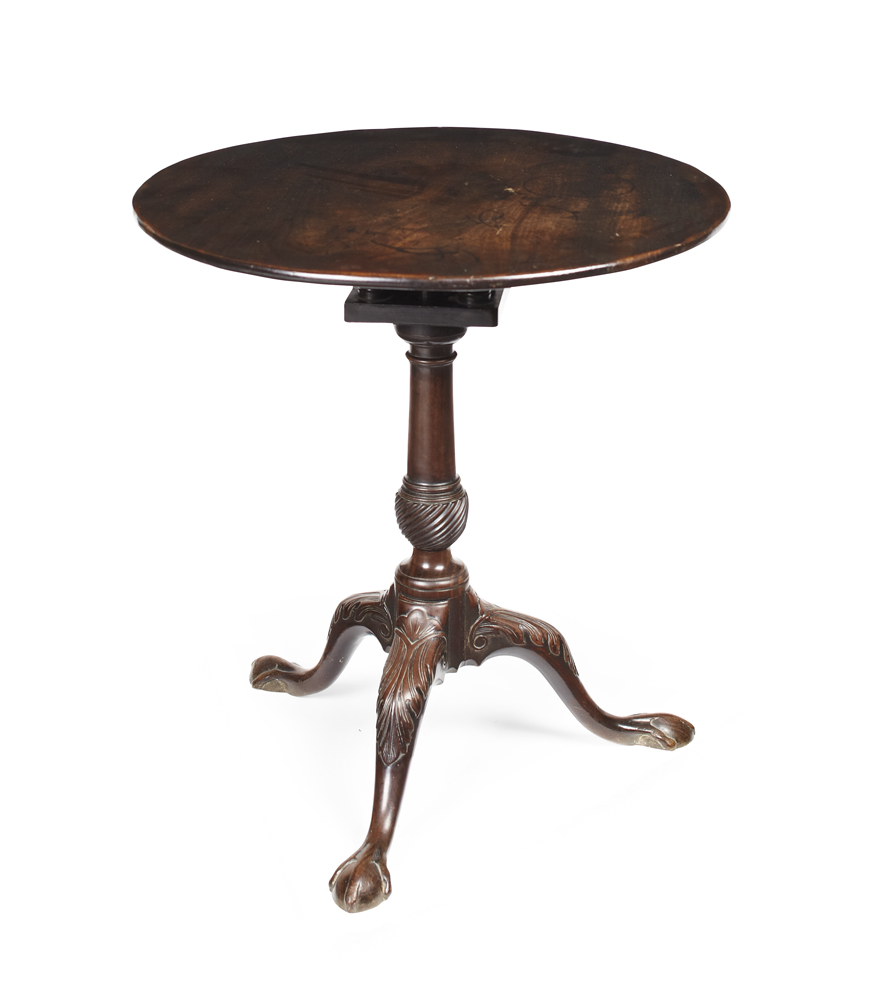 the circular top above birdcage raised on turned and tapered column with spirally fluted knop, the tripod base with leaf-carved cabriole legs terminating in ball and claw feet, minor alterations