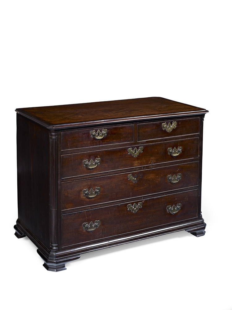 with crossbanded rectangular top above two short over three long graduated drawers enclosed by inset reeded columns to the angles and raised on ogee bracket feet (cut)