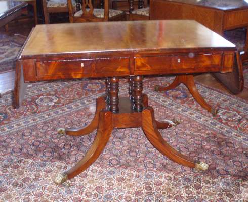 the rectangular top with rounded angles and twin drop flaps, above twin frieze drawers and four turned columns, the square base with sabre legs terminating in brass caps and castors