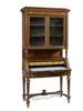 the moulded cornice above a pair of glazed panel doors enclosing adjustable shelves, below is a fall front, opening to reveal a fitted interior with drawers and an inset velvet writing surfacem over two further frieze drawers, raised on simulated turned fluted legs, united by a shapd stretcher and ending in toupie feet