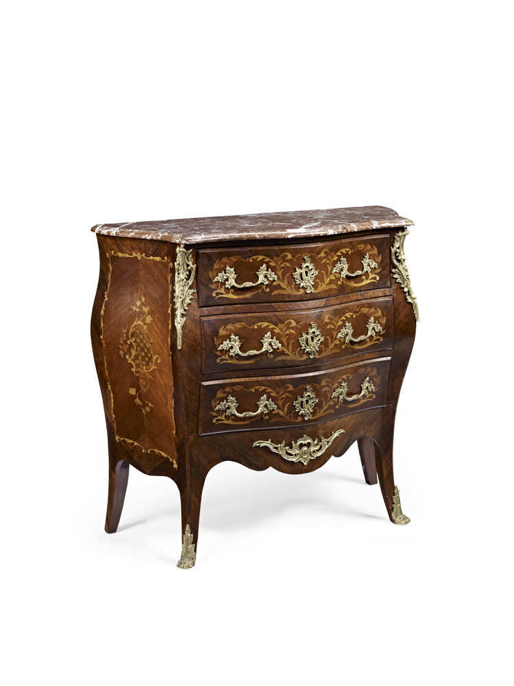 LOUIS XV STYLE ROSEWOOD AND MARQUETRY BOMBE COMMODE