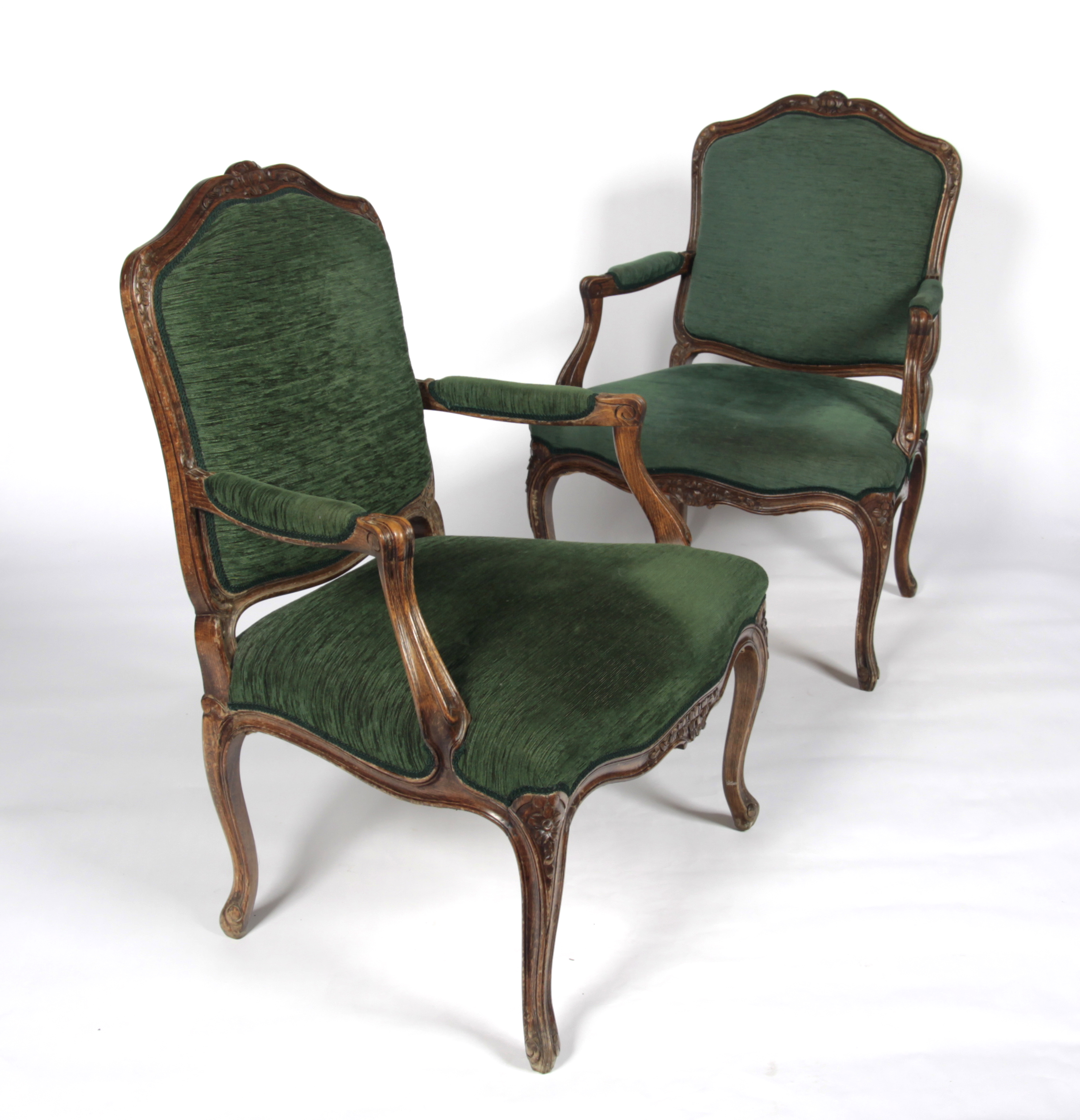 each with floral carved moulded serpentine top-rail over cushioned back, moulded scroll open arms serpentine seat floral carved apron, raised on cabriole legs terminating in scroll feet, upholstered in deep green (2)
