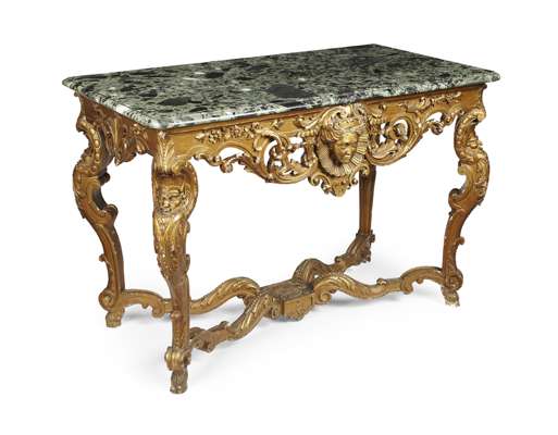 the green moulded marble top above an ornate rococo scroll openwork frieze centred by a mask motif, raised on carved cabriole legs united by shaped X form stretcher