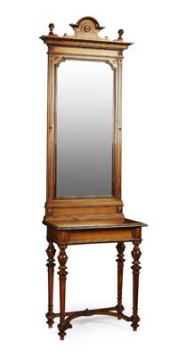 the rectangular plates within fluted frames, surmounted by arched crestings and spiral reeded ball finials, the tables with moulded tops above panelled frieze, raised on baluster turned legs united by shaped stretchers