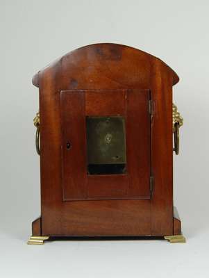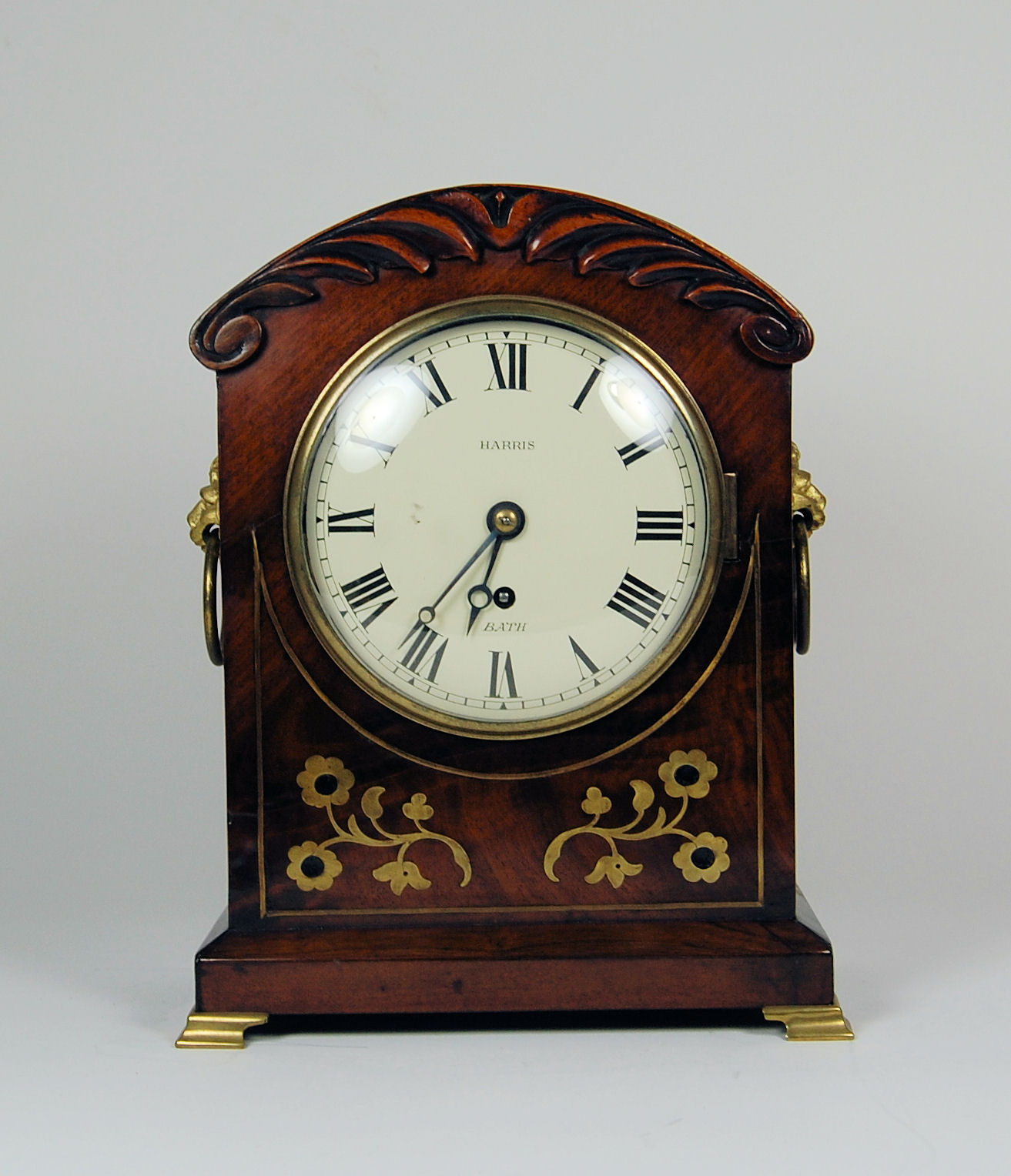 the white painted dial signed by Harris of Bath, with Roman numerals and a single train fusee movement, the domed case with lions mask and loop handles, raised on brass ogee bracket feet
