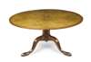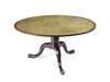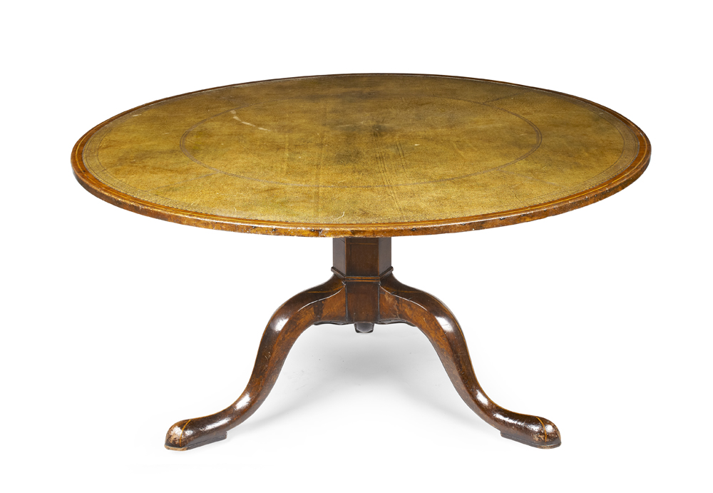 the circular tilt top with a tooled green leather inset, raised on a hexagonal column support ending in a tripod base