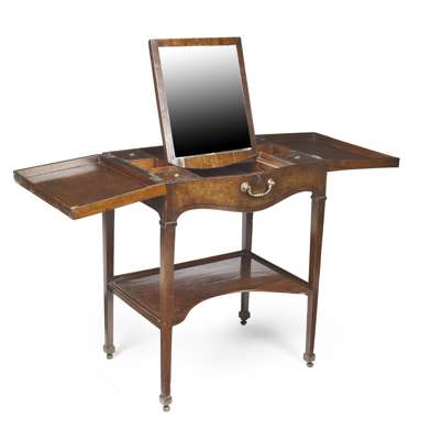 the hinged top enclosing a compartmented interior with ratchet adjustable mirror, above a dummy frieze drawer, raised on square tapered legs united by an undertier and ending in spade feet