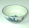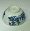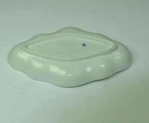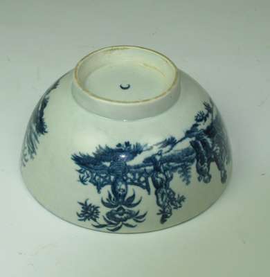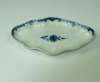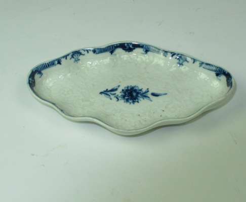 blue printed with three figures and a fence opposing two figures by a pavilion, crescent mark, 16cm diameter; together with a lozenge shaped relief moulded blue painted Worcester spoon tray with central chrysanthemum panel, open crescent mark, 15cm diameter (2)
